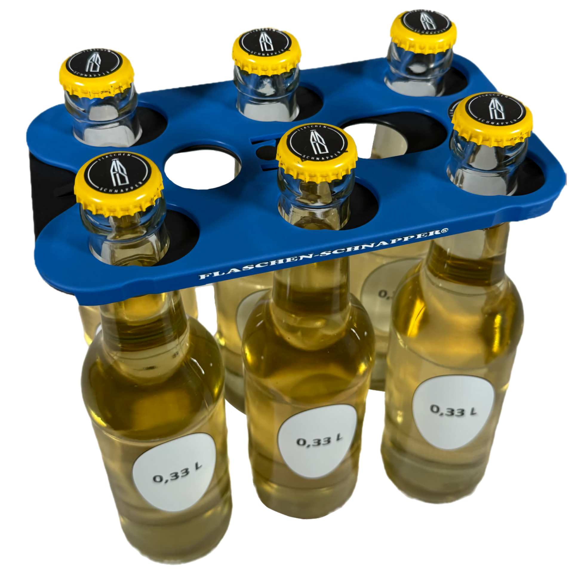 Durch den Flaschen-Schnapper® kann man sich sein eigenes Six-Pack direkt aus dem Kasten greifen, hierbei spielt es keine Rolle ob es ein 0,33 oder 0,5 Liter Kasten ist, der Flaschen-Schnapper® passt immer. So kann man bequem bis zu 6 Flaschen in nur einer Hand tragen.