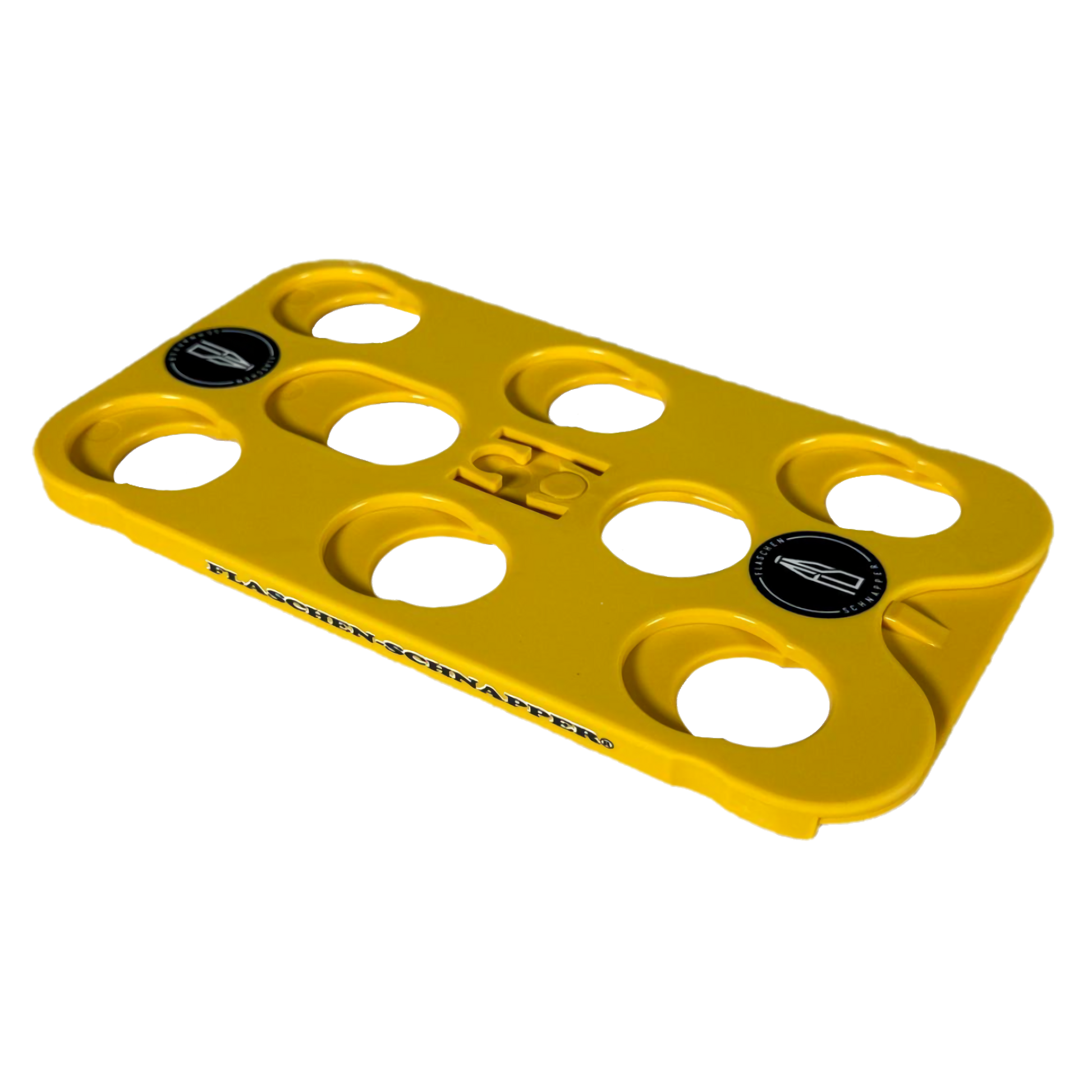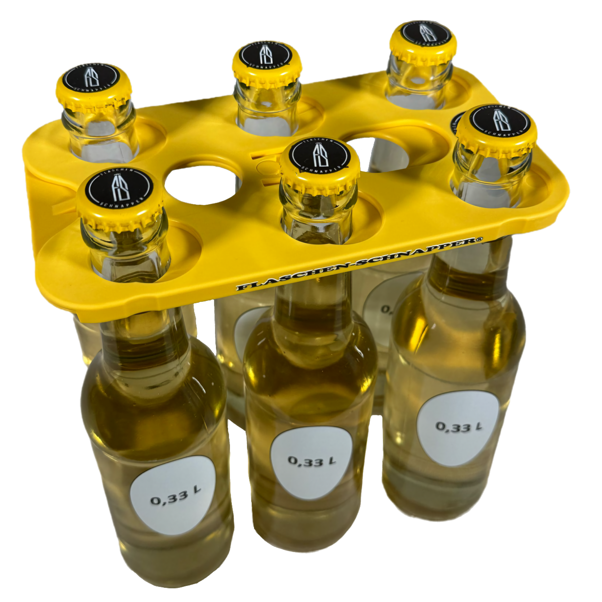 Durch den Flaschen-Schnapper® kann man sich sein eigenes Six-Pack direkt aus dem Kasten greifen, hierbei spielt es keine Rolle ob es ein 0,33 oder 0,5 Liter Kasten ist, der Flaschen-Schnapper® passt immer. So kann man bequem bis zu 6 Flaschen in nur einer Hand tragen.