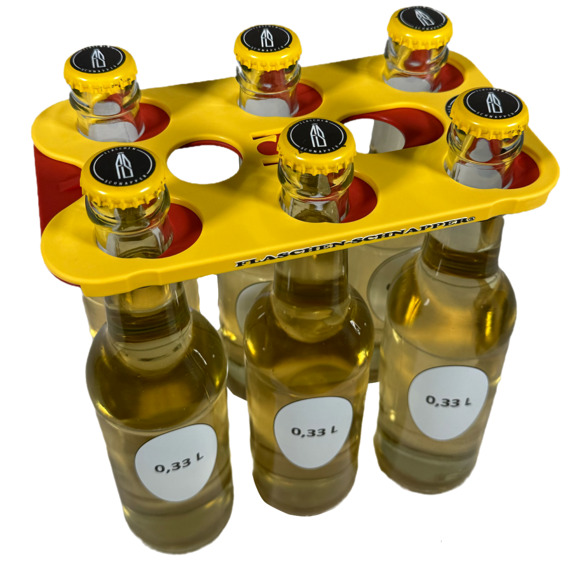 Durch den Flaschen-Schnapper® kann man sich sein eigenes Six-Pack direkt aus dem Kasten greifen, hierbei spielt es keine Rolle ob es ein 0,33 oder 0,5 Liter Kasten ist, der Flaschen-Schnapper® passt immer. So kann man bequem bis zu 6 Flaschen in nur einer Hand tragen.