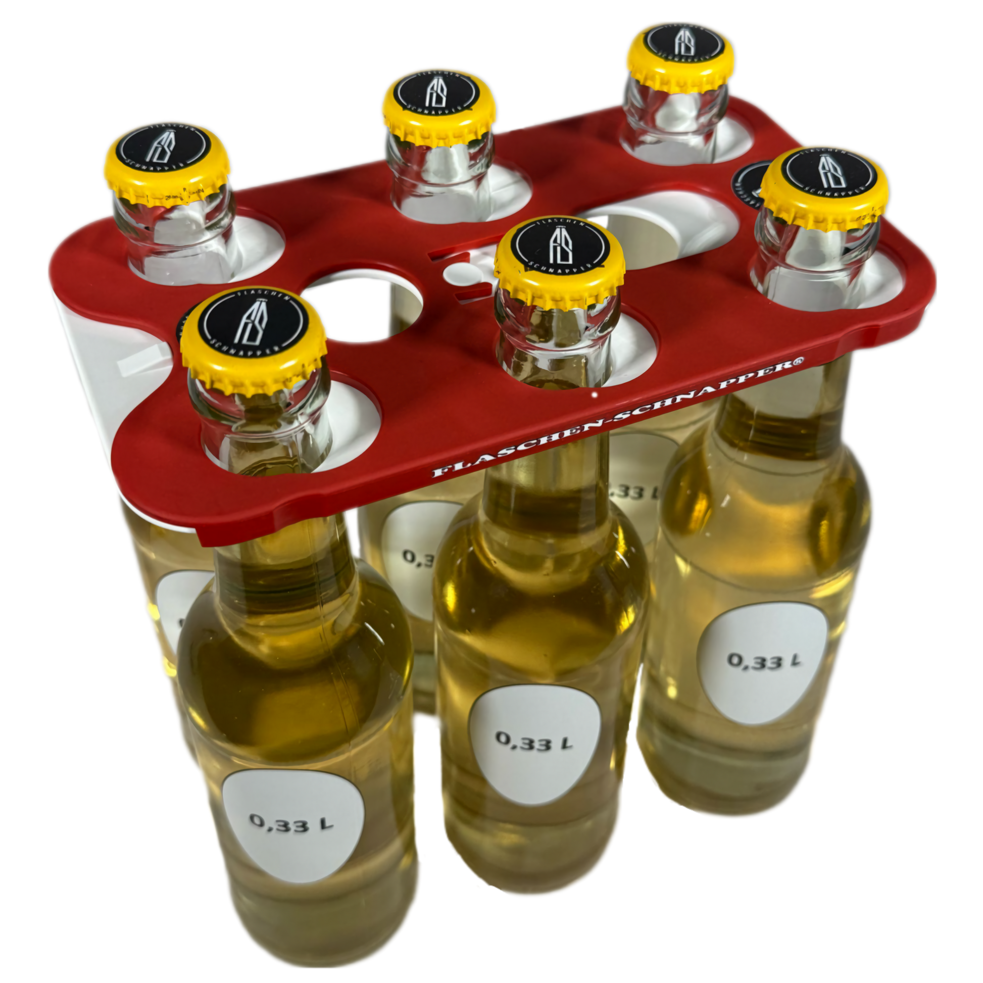 Durch den Flaschen-Schnapper® kann man sich sein eigenes Six-Pack direkt aus dem Kasten greifen, hierbei spielt es keine Rolle ob es ein 0,33 oder 0,5 Liter Kasten ist, der Flaschen-Schnapper® passt immer. So kann man bequem bis zu 6 Flaschen in nur einer Hand tragen.