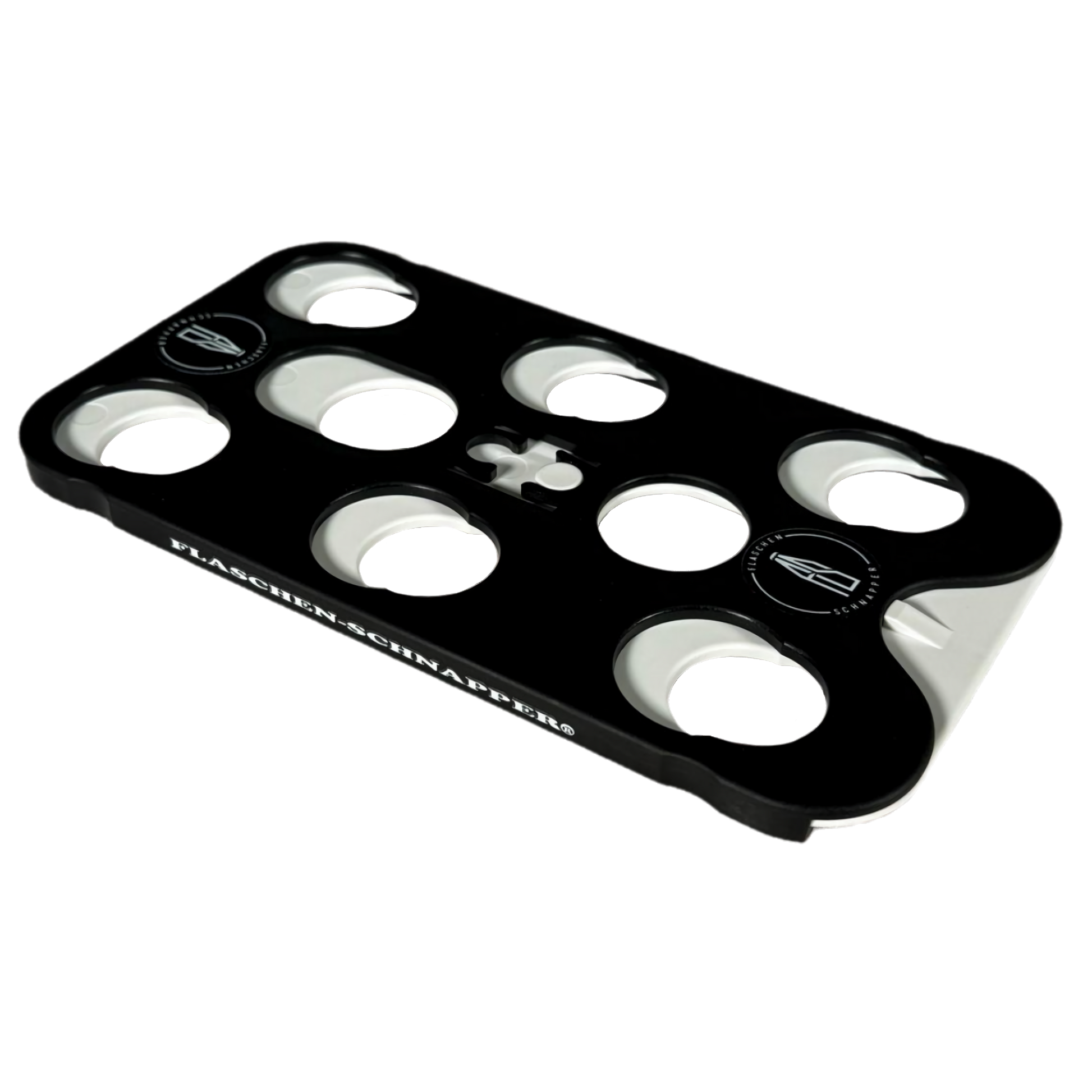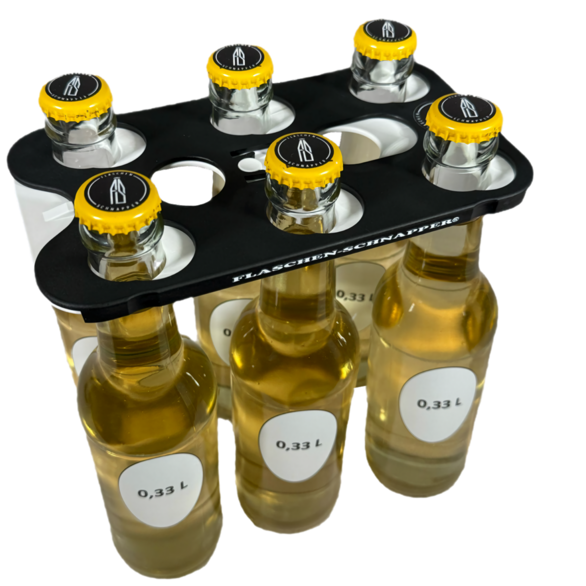 Durch den Flaschen-Schnapper® kann man sich sein eigenes Six-Pack direkt aus dem Kasten greifen, hierbei spielt es keine Rolle ob es ein 0,33 oder 0,5 Liter Kasten ist, der Flaschen-Schnapper® passt immer. So kann man bequem bis zu 6 Flaschen in nur einer Hand tragen.
