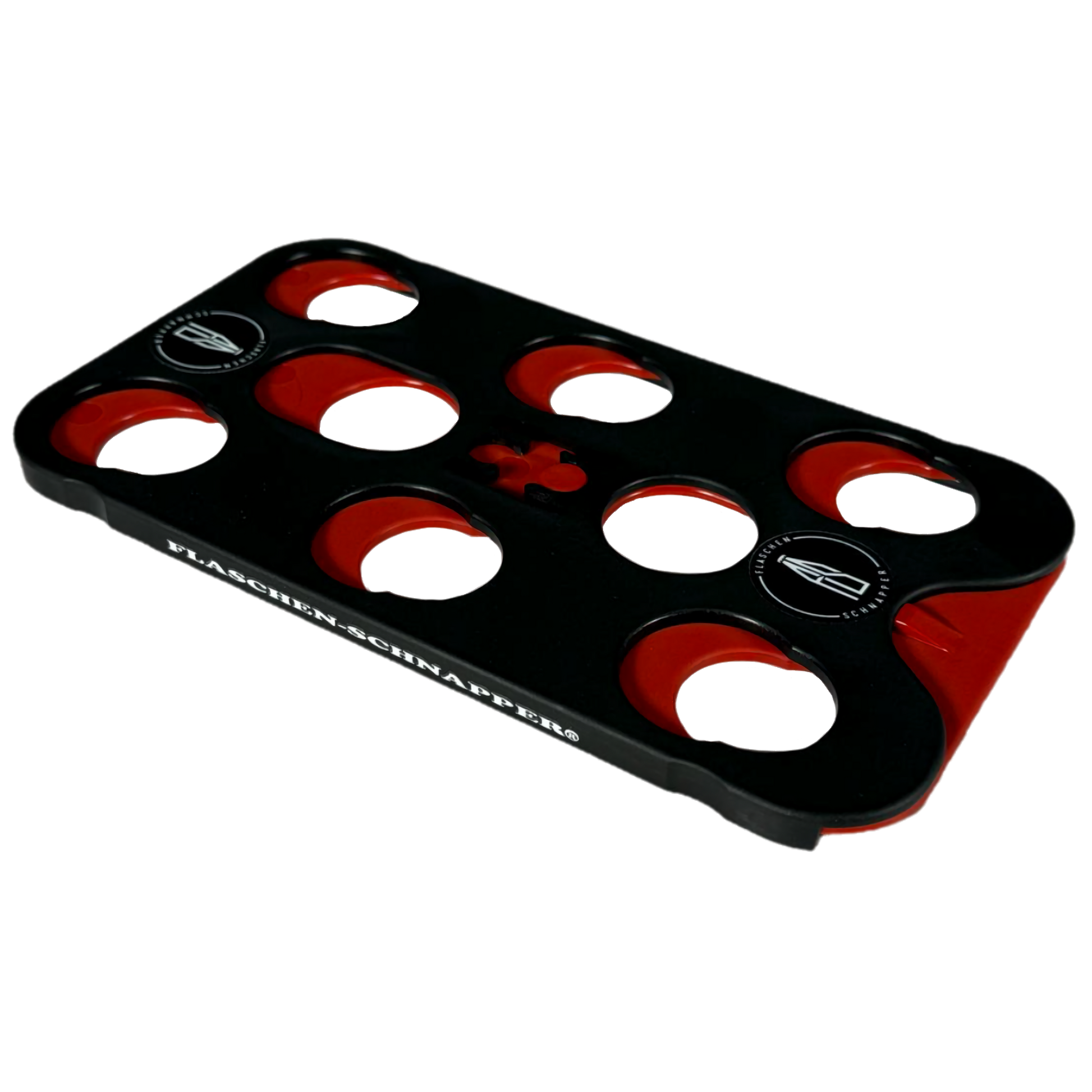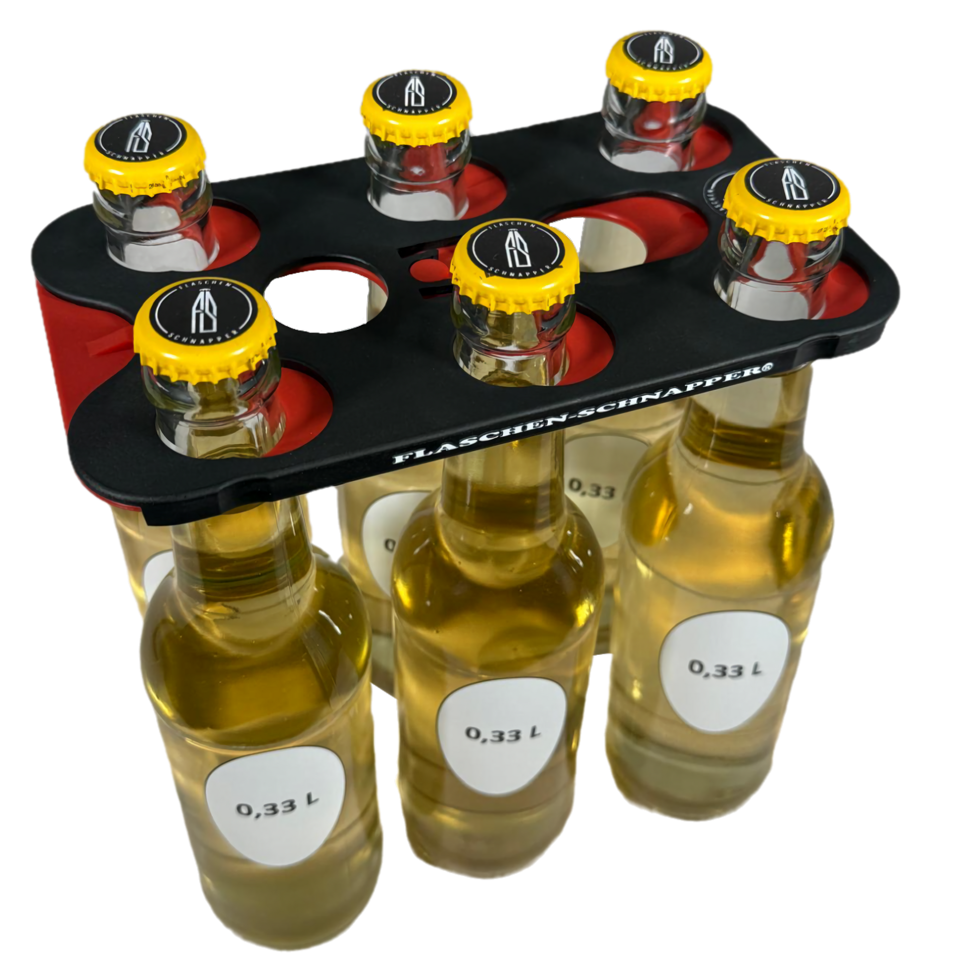 Durch den Flaschen-Schnapper® kann man sich sein eigenes Six-Pack direkt aus dem Kasten greifen, hierbei spielt es keine Rolle ob es ein 0,33 oder 0,5 Liter Kasten ist, der Flaschen-Schnapper® passt immer. So kann man bequem bis zu 6 Flaschen in nur einer Hand tragen.
