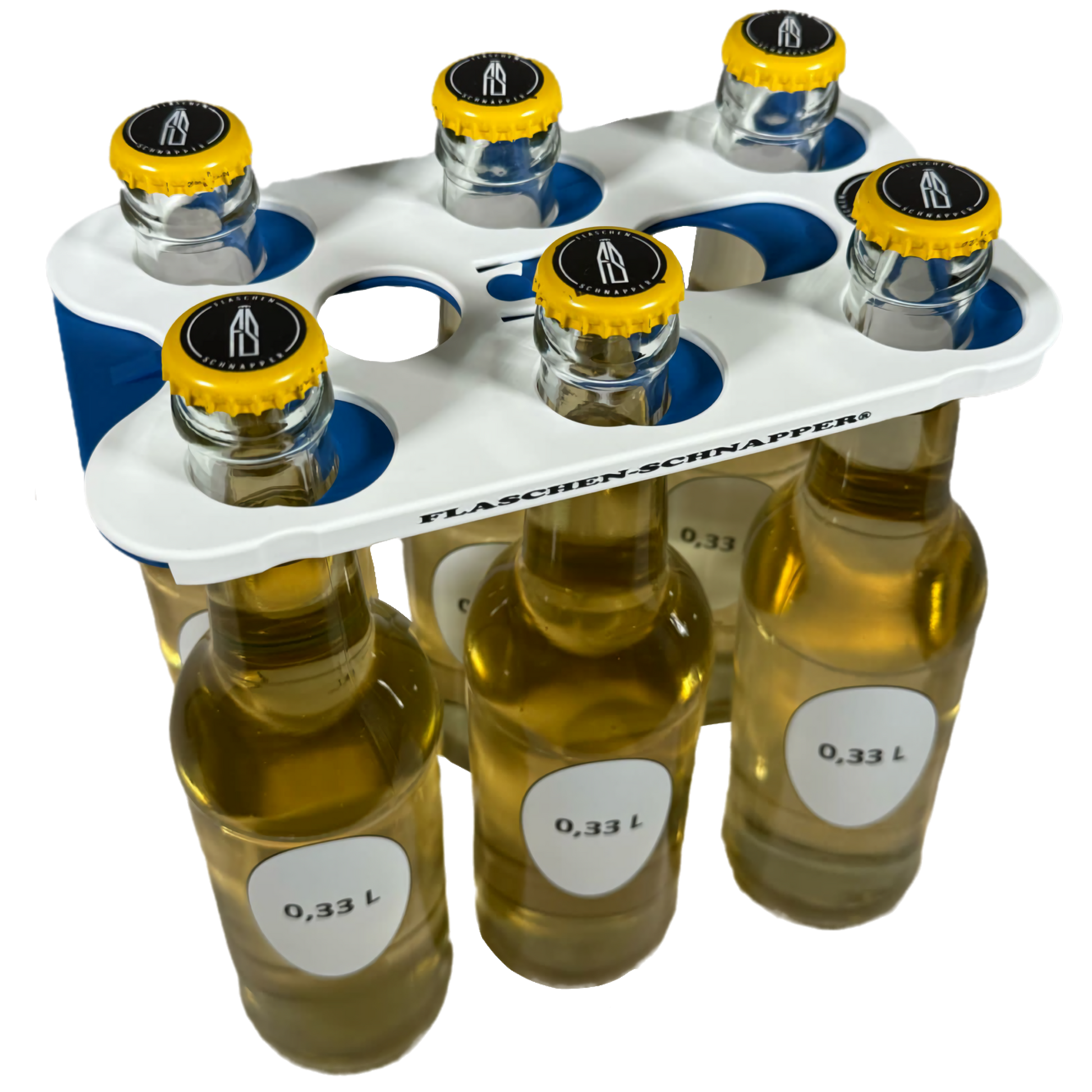 Durch den Flaschen-Schnapper® kann man sich sein eigenes Six-Pack direkt aus dem Kasten greifen, hierbei spielt es keine Rolle ob es ein 0,33 oder 0,5 Liter Kasten ist, der Flaschen-Schnapper® passt immer. So kann man bequem bis zu 6 Flaschen in nur einer Hand tragen.
