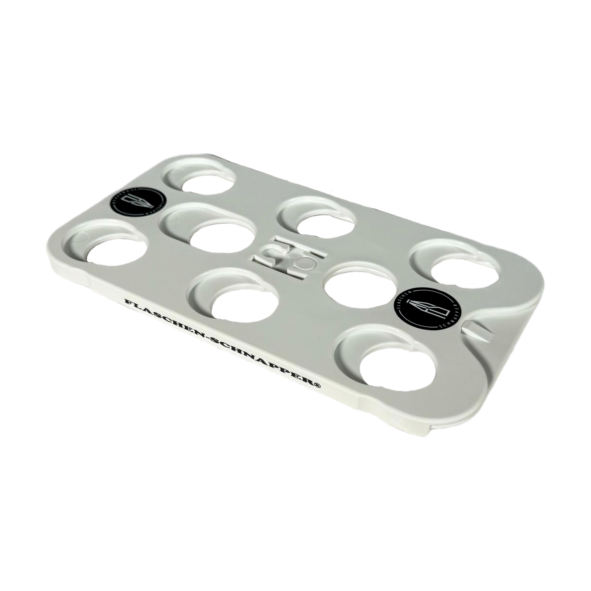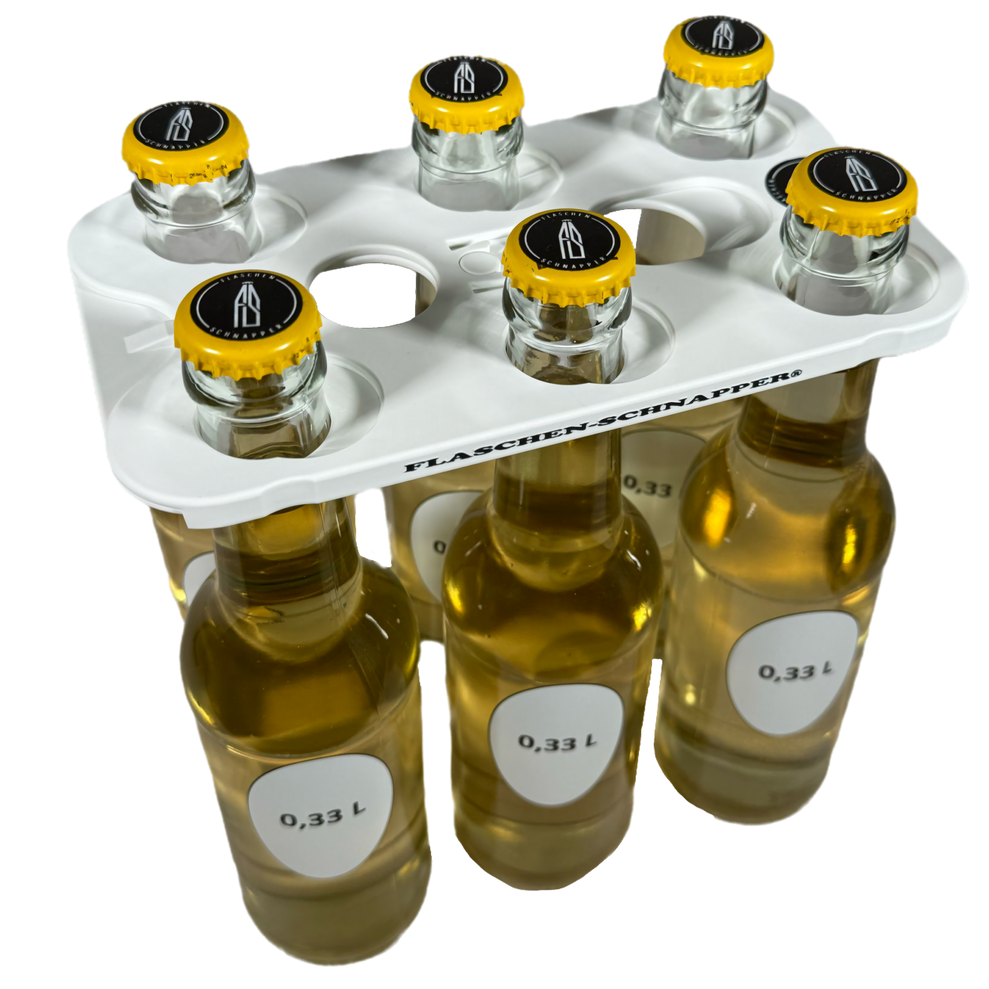 Durch den Flaschen-Schnapper® kann man sich sein eigenes Six-Pack direkt aus dem Kasten greifen, hierbei spielt es keine Rolle ob es ein 0,33 oder 0,5 Liter Kasten ist, der Flaschen-Schnapper® passt immer. So kann man bequem bis zu 6 Flaschen in nur einer Hand tragen.