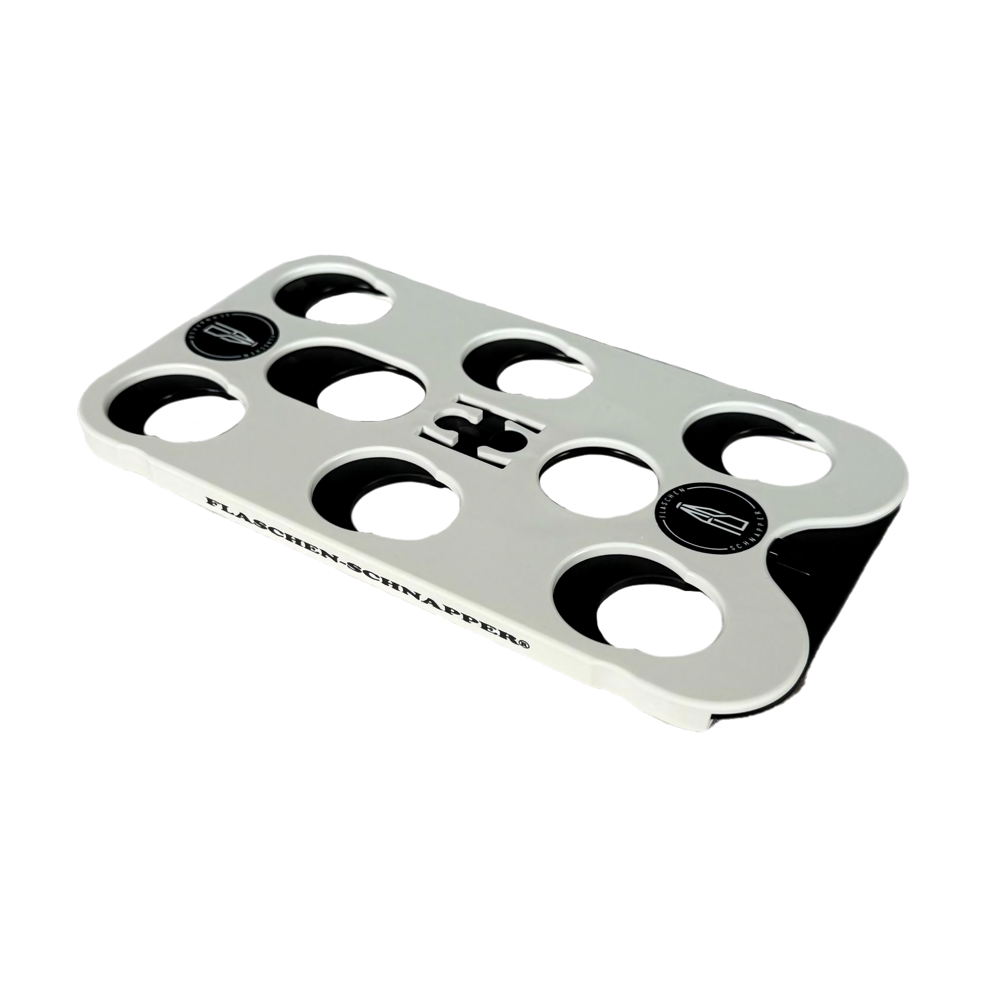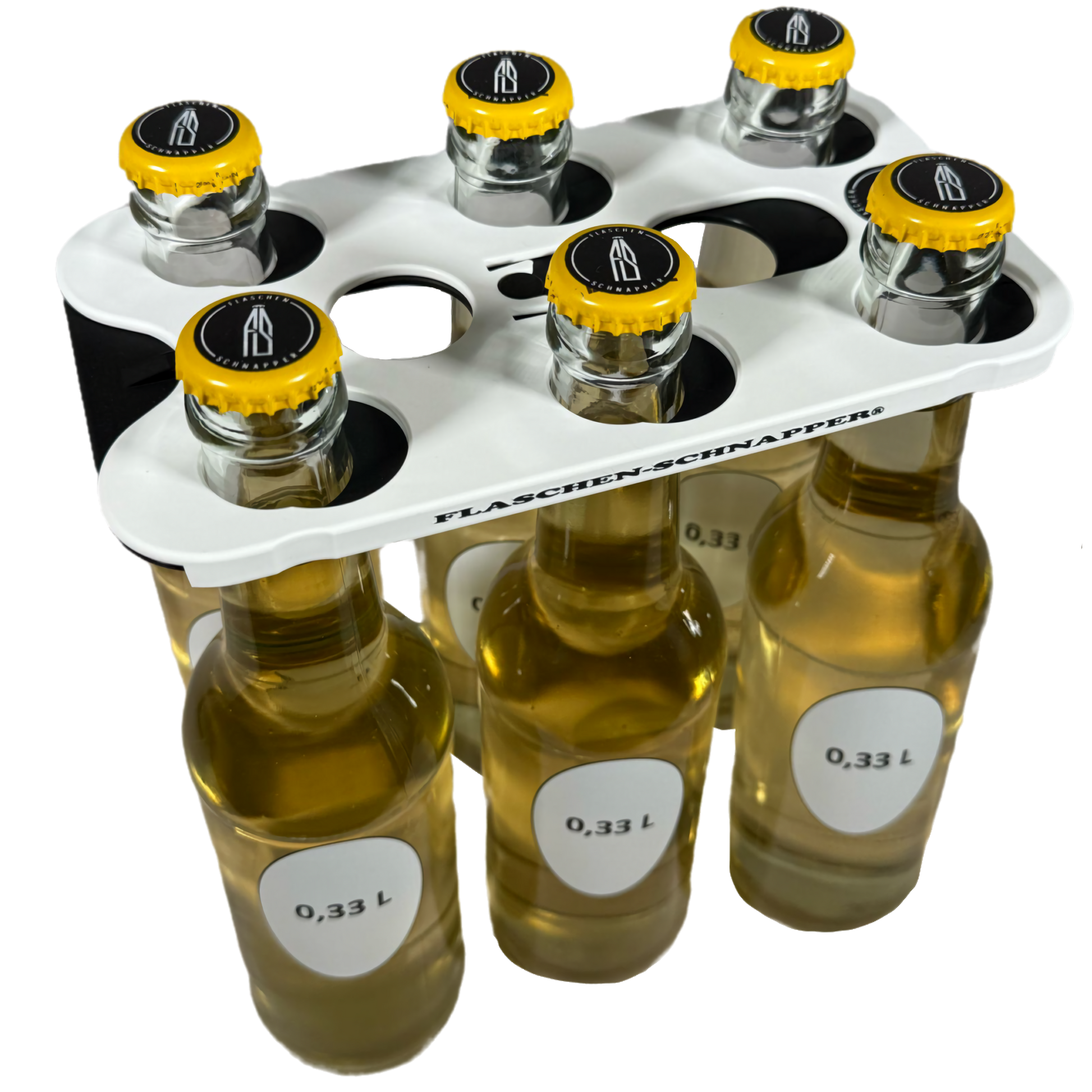 Durch den Flaschen-Schnapper® kann man sich sein eigenes Six-Pack direkt aus dem Kasten greifen, hierbei spielt es keine Rolle ob es ein 0,33 oder 0,5 Liter Kasten ist, der Flaschen-Schnapper® passt immer. So kann man bequem bis zu 6 Flaschen in nur einer Hand tragen.